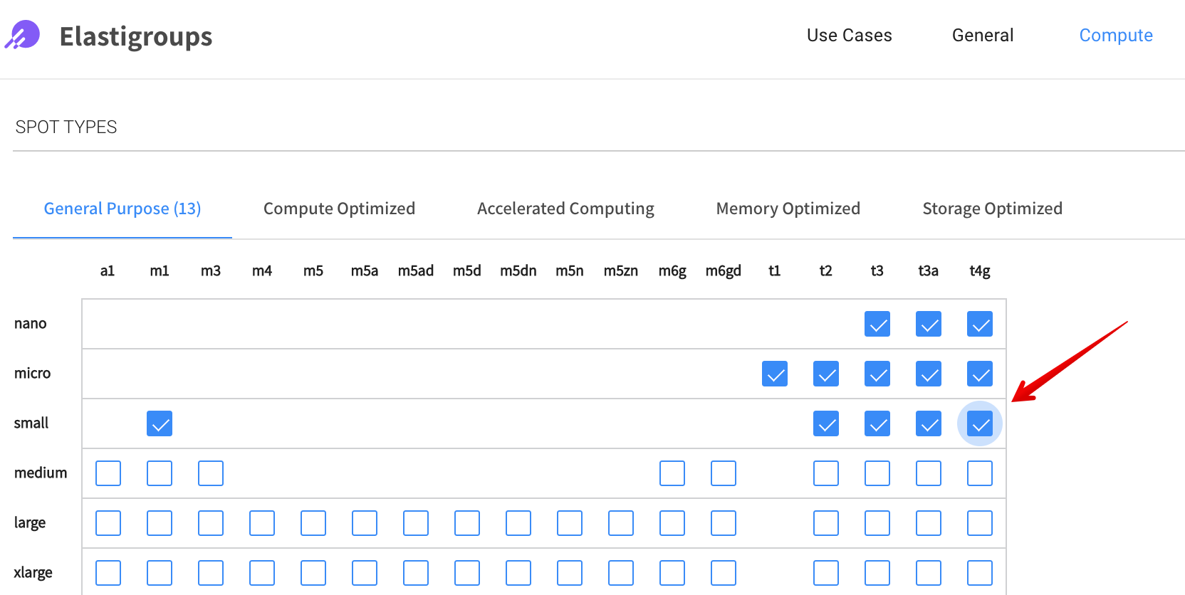 2. Go to the Compute tab and scroll down to Spot Types. (If you are creating a new Elastigroup, you must complete the required information in the General tab before you can enter the Compute tab.)